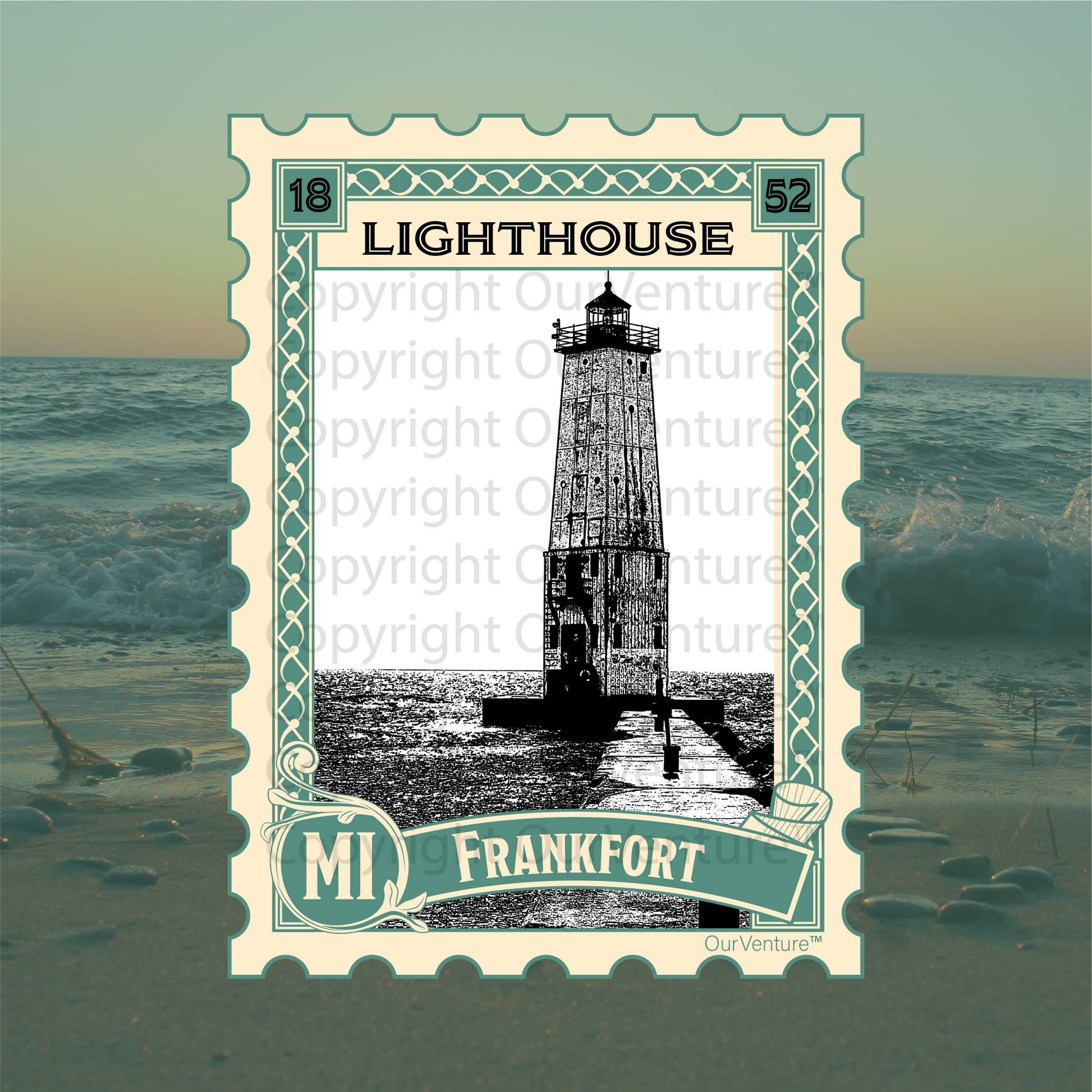 - Design: Vintage postage stamp style featuring the Frankfort Light Station