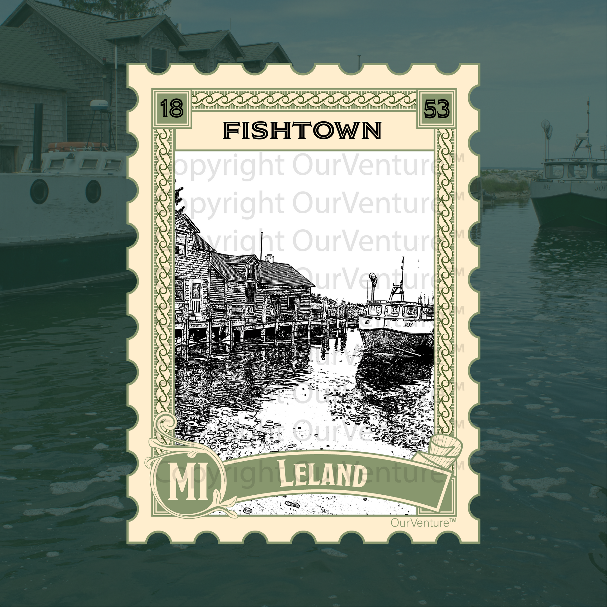 - Design: Vintage postage stamp style featuring Leland’s historic Fishtown