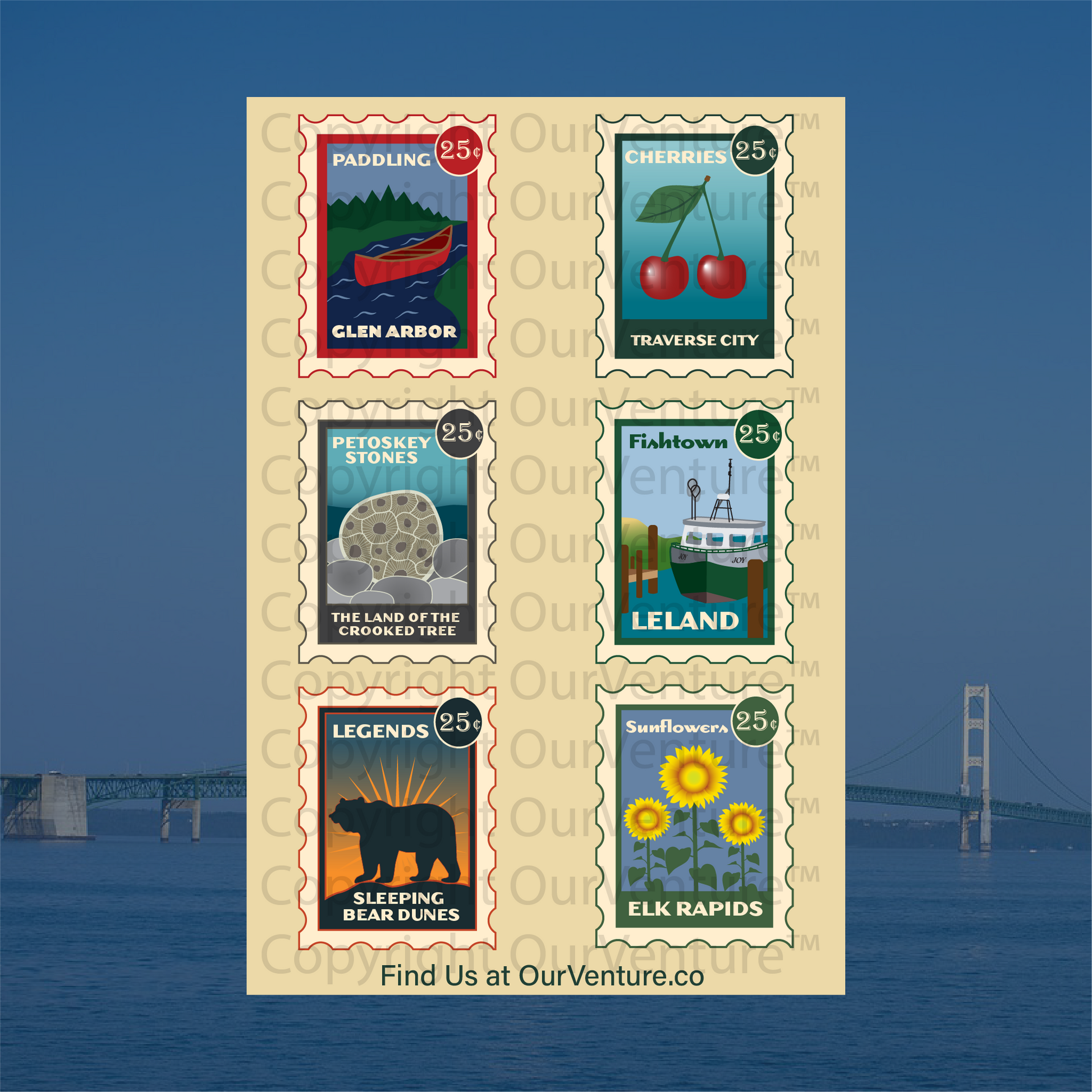 Designs: Includes six vintage postage stamp–style illustrations of beloved northern Michigan icons